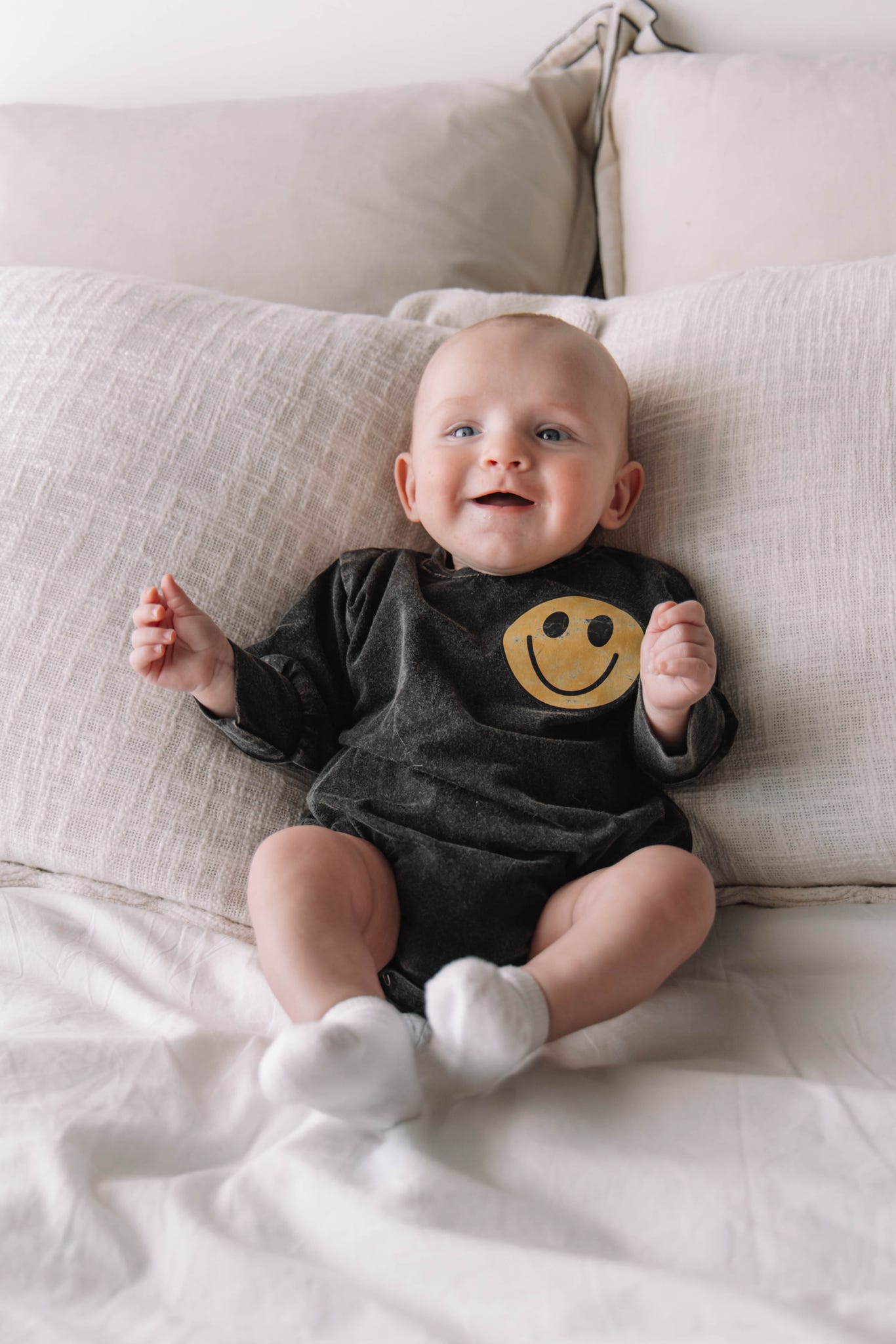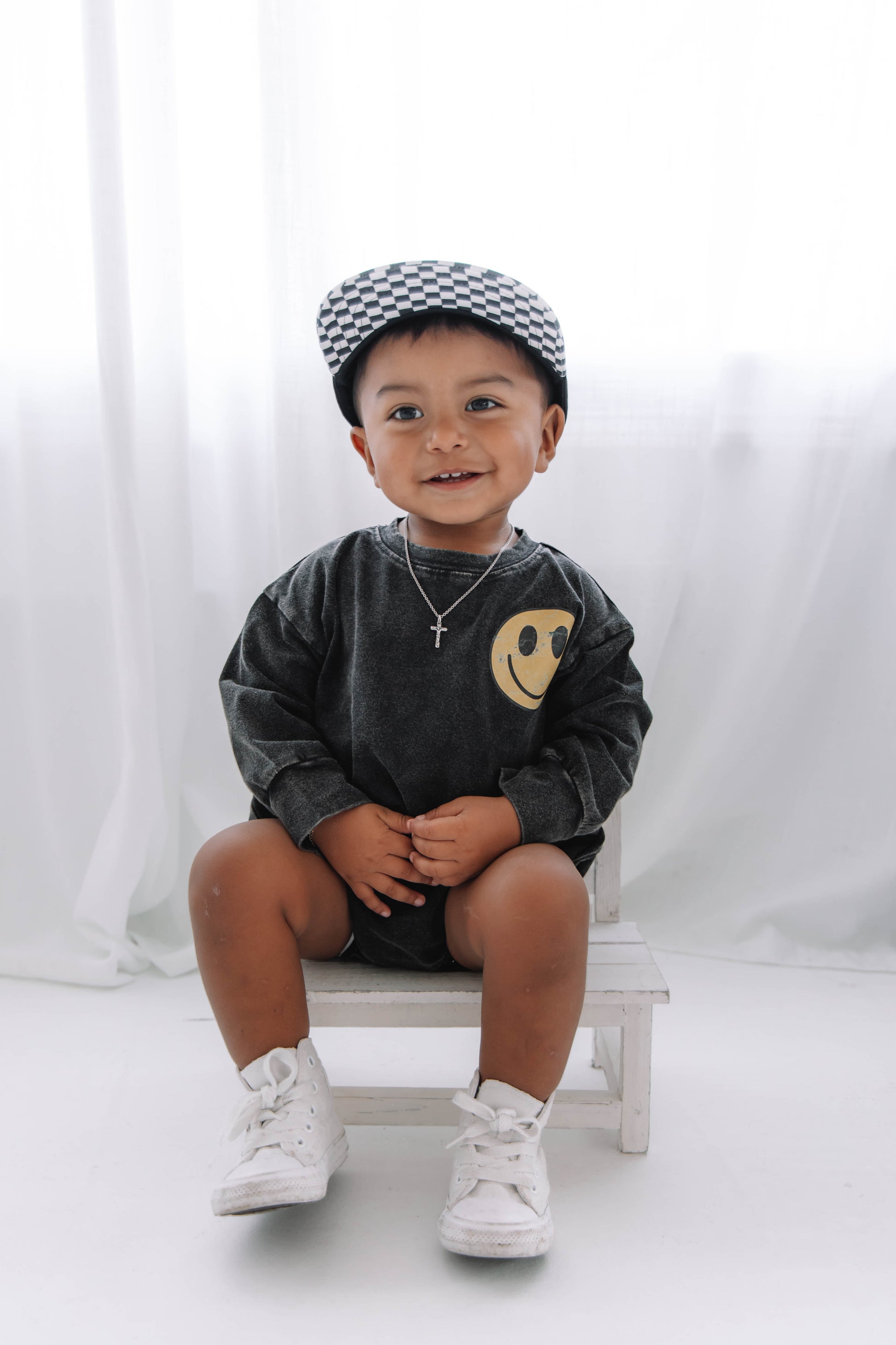 Elevate your look with our Acid Wash Bubble long sleeve romper! The unique acid wash adds a touch of edge, and the small smiley face dtf print exudes playful vibes. Made to fit true to size, simply wash inside out and hang to dry. Boost your style with this must-have piece!